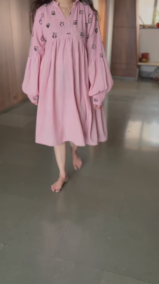 PEACH HAND BLOCK PRINTED ANTIFIT GATHER DRESS